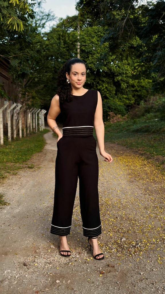 CONJUNTO PANDORA. Regata modelo maxi croped com barrado de linhas brancas igual a calça. Calça cintura alta, com bolsos funcionais nas laterais e zíper atrás para facilitar o vestir.
