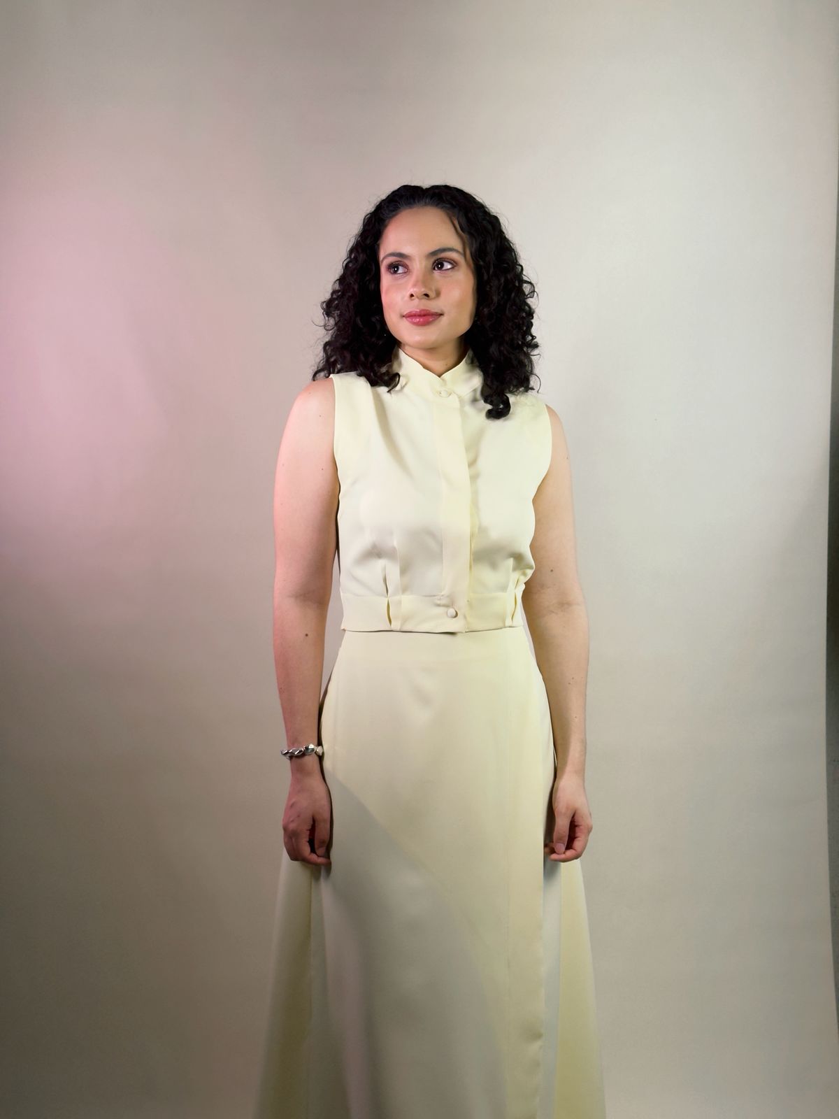 CONJUNTO VIENA. Blusa sem mangas, gola clássica e fechamento frontal por botões e cinto do mesmo tecido costurado a peça para valorizar a silhueta. Saia longa com recortes sutis (estilo envelope), com ziper atrás.